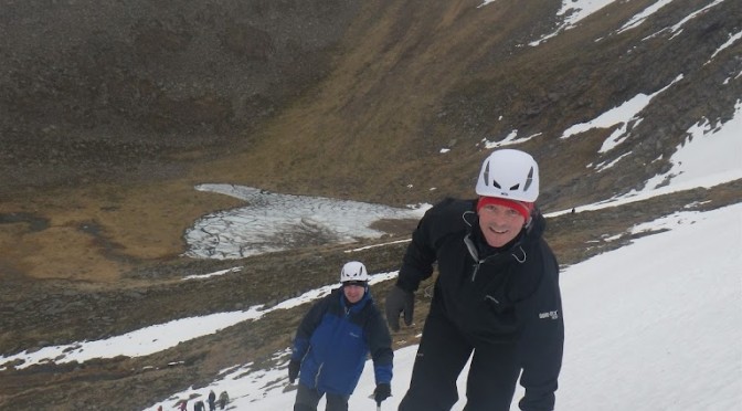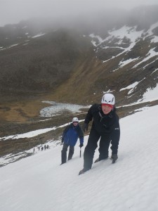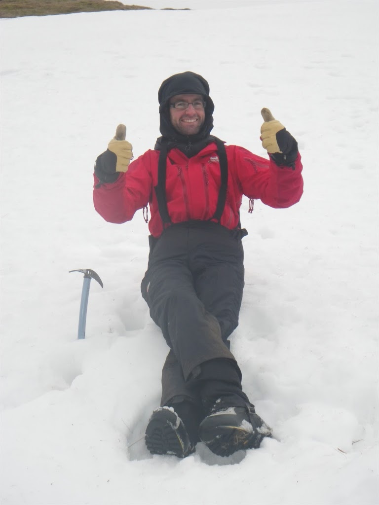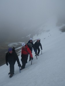 This week I am working on a winter mountaineering course for tollymore, with Tom, Paul, Lee and Ernie. Day one saw us heading up into Coire nan Lochan to look at moving on snow. We found quite a bit of snow that had managed to withstand the thaw in behind the shoulder of lochan, the easterly aspect also meant that we were out of the wind. The focus of the day was to look at moving about with and without crampons on, how to move effectively on snow to minimise the chances of a slip, and what to do if we do get to the point of a slip or a slide. On our travels we bumped into John Rutherford who was out and about, so he joined us for a while. It was a good start to the week, with the rain staying of all day, the forecast for the 1st part of the week is giving milder tempeartures but generally drier, so it will be an improvement on last week not to be arriving home soaked each day!!