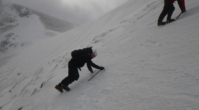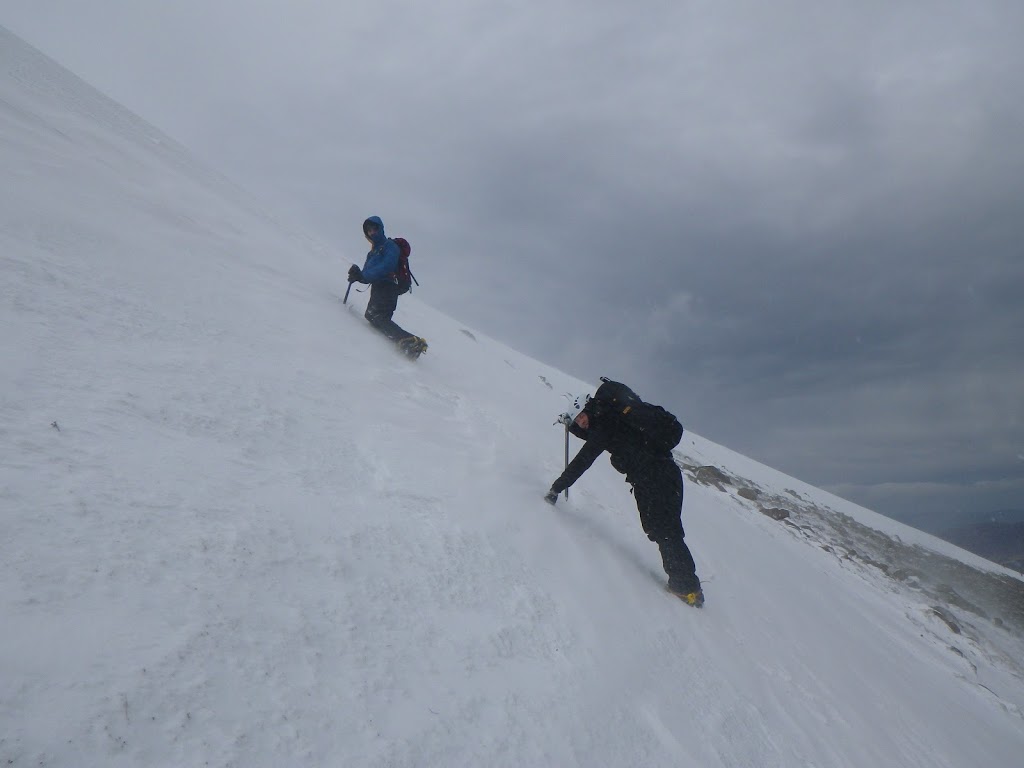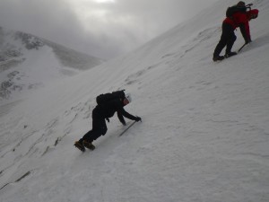 Today we headed into the shoulder of Lochain. This provided us with some steeper snow than yesterday and gave us a good opportunity to expand on our crampon skills. It was forecast to be a pretty windy day, with winds increasing throughout the day. I opted not to head up onto the plateau, didnt see the point in suffering just for the sake of suffering!! Instead we headed onto the top of the shoulder of Lochain and spent the rest of the day looking at navigation. It wasnt really a day for taking photos once we had left the shelter of the snow slopes, so here are just a few from the start of the day.