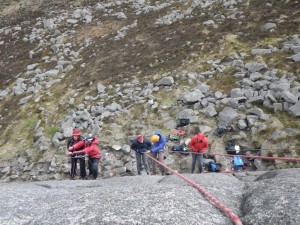 I have done a few bits and pieces of work with the queens mountaineering club over the last few years, and on Saturday I headed out with 6 of the guys to do a workshop on self rescue. We made our way up to meelmore buttress and the bearnagh slabs, starting of with some fundamental skills in a single pitch environment before heading onto the multipitch routes of the bearnagh slabs. Although a little bit on the cold side it was good to get out with the guys, I came through the club myself, so its always nice to be able to put a little bit back in.